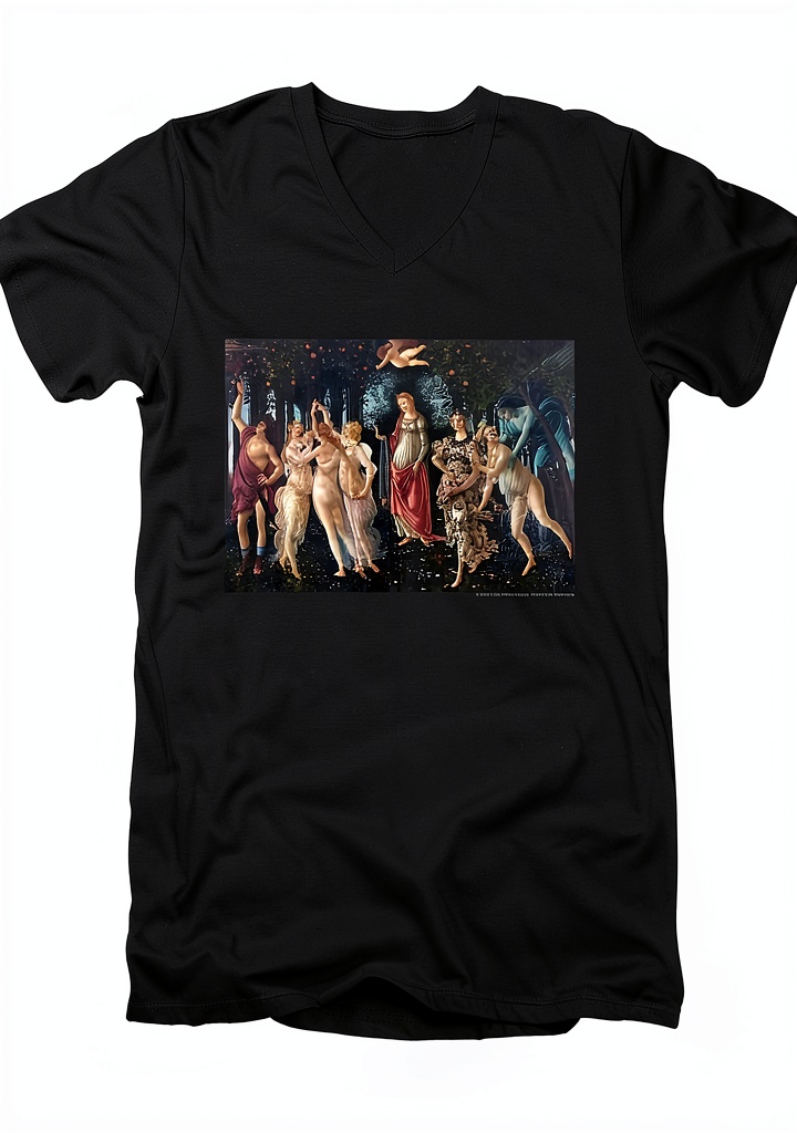 The Sandro Botticelli Primavera unisex V-neck T-shirt combines style and comfort for everyday wear. Featuring a classic V-neck design, it is made from high-quality cotton fabrics that ensure a soft, breathable feel. This adult T-shirt includes a detailed graphic print inspired by the Primavera artwork, officially licensed and hand-illustrated by skilled artists. Key specifications include model number AV.PIERCE108, department for men, and availability from February 18, 2026. With multiple sizes from Small to XX-Large in Black, it offers a versatile fit for various body types.