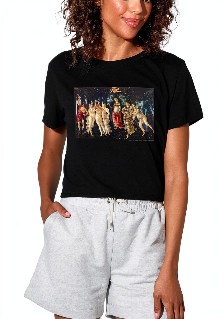 Introducing the Sandro Botticelli Primavera women’s crop top t-shirt, a stylish addition to any wardrobe crafted from 100% cotton for superior comfort and breathability. This officially licensed graphic tee features an artistic Primavera design, meticulously printed in the USA to ensure high-quality detailing and durability. With a model number WCT.PIERCE108 and available in sizes from Small to X-Large in classic Black, it offers a flattering fit for various body types. The lightweight fabric and crop style make it perfect for layering or wearing solo, blending fashion with functionality for everyday use.
